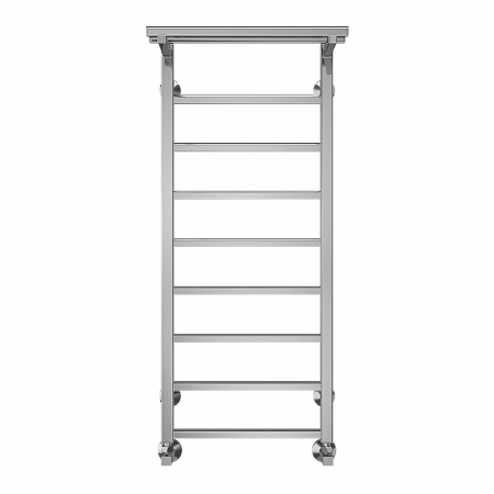 Модель "Контур с полкой" относится к линейке в стиле хай-тек, тяготеющей к лаконичным формам и хромированным поверхностям, и отличается наличием дополнительной прогреваемой полки для хранения и сушки полотенец.